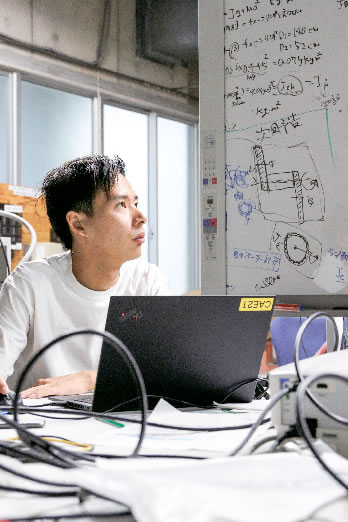ある企業と共同でモータについて研究中。シミュレータを使って基本モデルに変更を加えた際の変化の解析を中心に取り組んでいます。答えはありませんから、失敗したり、指摘されたり叱られたりしながら、がむしゃらにやるしかありません。自分のペースで自由に進めていますが、その分、自分をちゃんと管理しなくてはならないので、自分を鍛えることができます。