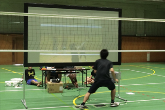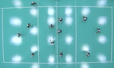 ![]() 映像刺激装置を用いたブロック 反応時間の測定風景 ![]() バレーボール選手の移動距離の測定時に 用いた天井カメラからの画像 |