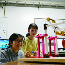 重力をエネルギー源とし、動力源を必要としない空中ブランコロボットを研究しています。空中のロボットが手を使って、上り勾配のあるブランコ段を連続して次々に乗り継ぐことができます。また子ども向けにペーパークラフトで空中ブランコロボットを再現することも目指しています。紙で小型化するためには、どのような素材をどう構築していくかを考える必要があり、その過程で培われる分析力、考察力、論理的思考力は、エンジニアにとって大きな武器になります。