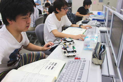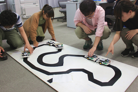 「情報演習D」は、マイクロコンピュータを搭載したライントレースカーを教材として、これまでに学んだプログラミングの知識やコンピュータ制御の基礎技術を用い、さまざまな演習を行います。