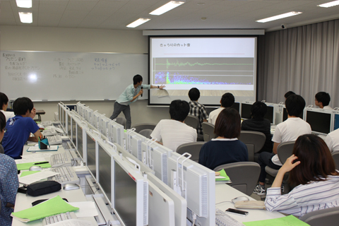 「情報演習C」は、マルチメディア処理に関するコンピュータ技術について学びます。音響信号の生成方法と記録、分析、音声の認識と合成の技術を身につけることが目的です。