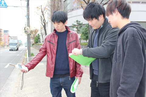 身の回りに溢れている音も分析の対象となります。例えば街の「騒音」。騒音計を持って街に出て、自動車の通行騒音などを測定し、その特性を分析します。また、学生が学外に出て、自分たちの感じる「心地よい音」と「不快な音」を収集し、その音を信号処理して分析し、両者の共通点や異なる点を分析します。なかには熱田神宮の玉砂利を踏みしめる音を、「心地よい音」として採集してきた学生もいます。その学生は、分析結果から一定のリズムで音が続くことが「心地よさ」の要因の一つと推測していました。