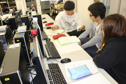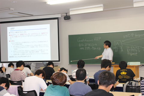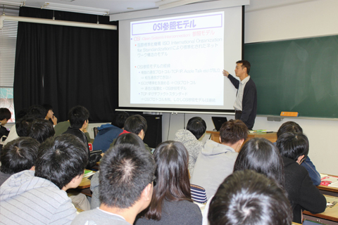 授業は、座学と実習を織り交ぜて行われます。座学で学んだことを実習で確認し、次のステップへ進みます。学生は、当初はなじみのない用語などに戸惑いを隠せないようですが、自分が日常的に使っているパソコンを使った実習を通じて、徐々に理解が進み、さらにネットワークの深いところに興味が湧き、面白さが増してきます。