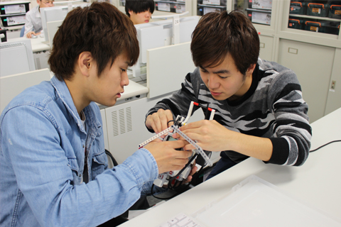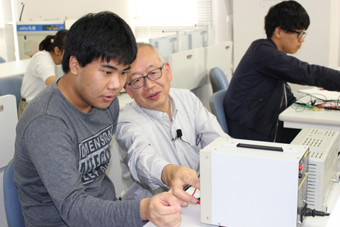 機械システム工学科では、「モノづくり」を大切にしています。中学校でも経験してきたであろうはんだ付けも、もう一度基礎から学びます。なぜなら、はんだ付けは電気回路をつくる上で欠かせない技術だからです。繰り返し学ぶことでモノづくりの基礎をしっかりと身につけます。また「メカトロニクス実習」では、レポートの提出が義務づけられていますが、評価は「考察」を重視します。「こういう実験をやりました」という報告ではなく、大切なのは、その結果から何を学び、何を考えたか? と「考える」こと。