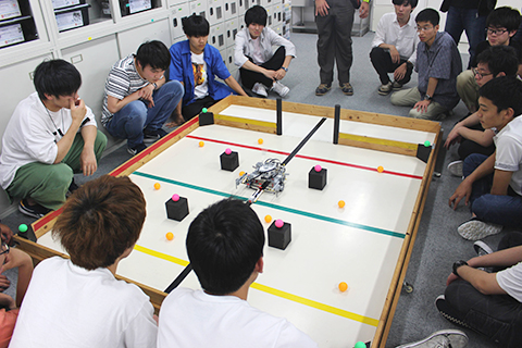 ロボットを動作させるために必要最低限のことは事前に学ぶものの、入学して間もない学生たちには専門知識や理論などはもちろんありません。ペアを組む仲間と議論しながら、自分たちなりに「ピンポン玉を集める」ために最適なロボットの形状および動作をさせるためのプログラムを考えます。