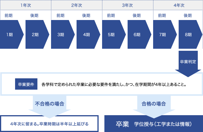 4年次終了時に卒業の要件を満たしているかの確認(卒業判定)が行われます。要件を満たしていれば卒業が認められ、要件を満たさない場合には、要件を満たすまで卒業は延期となり、卒業時期は半年以上延びることになります。