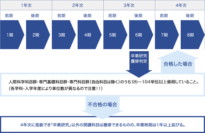 3年次終了時に卒業研究履修基準を満たしていれば、4年次への進級と同時に「卒業研究」の履修が認められます。基準を満たさない場合には、4年次に進級することはできますが「卒業研究」の履修が不可能となり、卒業時期は1年以上延びることになります。